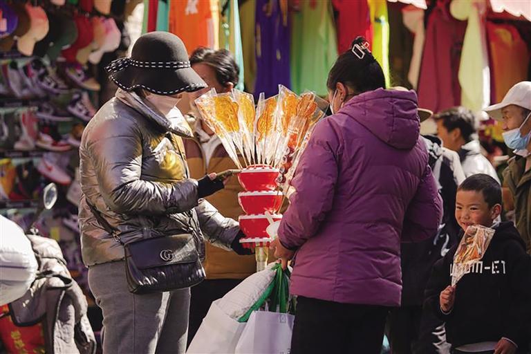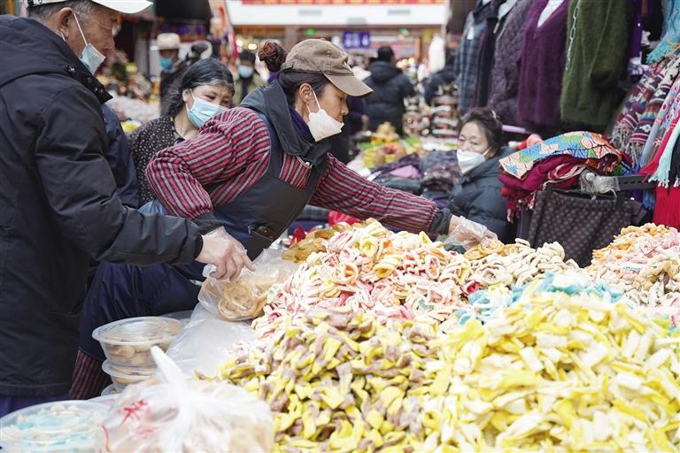 “市場(chǎng)現(xiàn)有1200多家商戶,經(jīng)營(yíng)商品有零食、蔬菜、肉類、干雜、五金、服裝等。藏歷新年臨近,每天前來(lái)置辦年貨的市民絡(luò)繹不絕,日均人流量超1萬(wàn)。為保證藏歷新年期間年貨充足,市場(chǎng)商戶們提前籌備、積極備貨,目前,各類商品庫(kù)存充足、品種豐富,基本上能夠滿足不同消費(fèi)者的需求。”沖賽康商貿(mào)有限公司負(fù)責(zé)人尼瑪告訴記者。此外,沖賽康市場(chǎng)將于2月19日至27日暫停營(yíng)業(yè),28日起正常營(yíng)業(yè)。