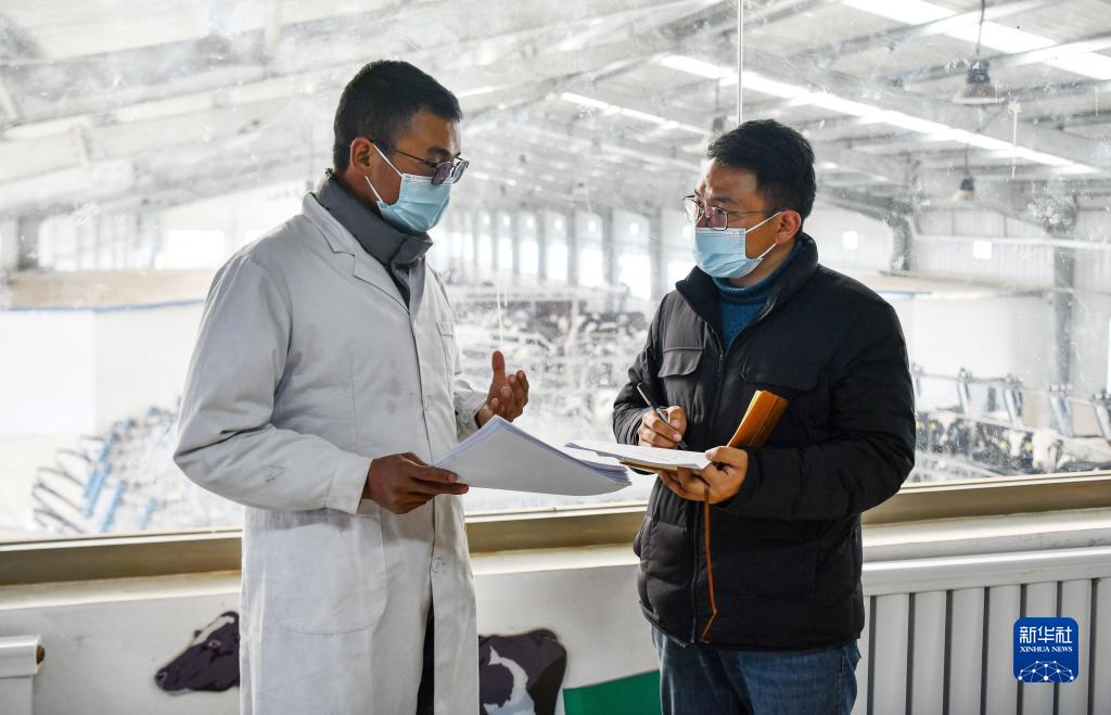 扎西江村(右)在隆子縣一家標(biāo)準(zhǔn)化奶牛養(yǎng)殖基地調(diào)研當(dāng)?shù)禺a(chǎn)業(yè)發(fā)展和帶動群眾增收情況(2月14日攝)。新華社記者 晉美多吉 攝