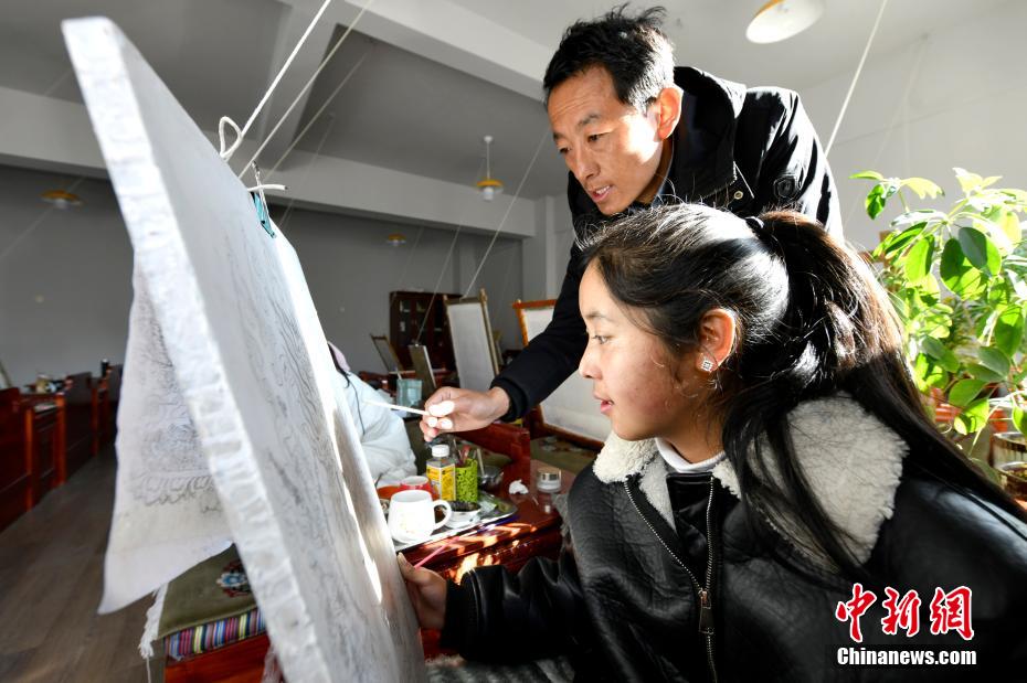 圖為3月8日,西藏唐卡畫院副院長貢覺杰(圖上)正在指導索朗次旺(圖下)繪制唐卡。