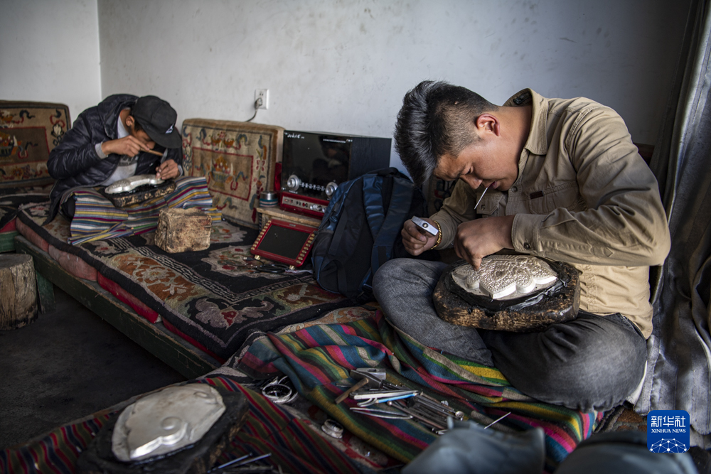 扎西吉彩金銀銅器加工廠工人正在給銀器鏨刻花紋(3月9日攝)。新華社記者孫非 攝