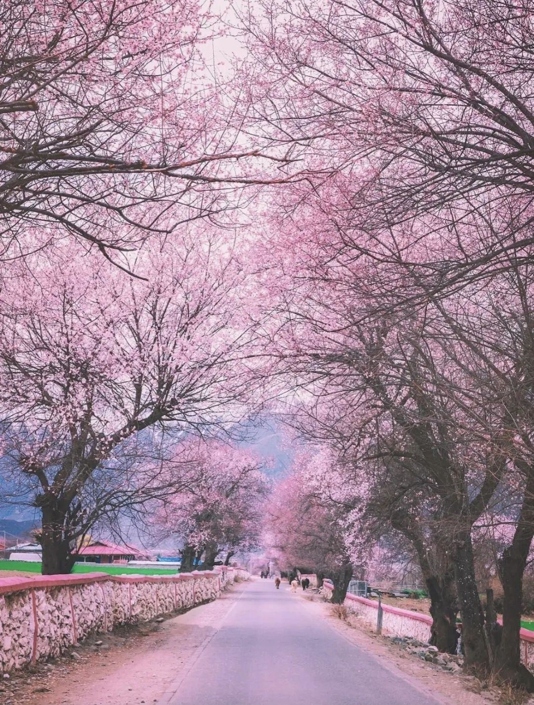 三月初綻的桃花就是這里的迎春花,遠處雪峰矗立潔白,近處溪流潺潺清澈,再加上漫山遍野粉色的桃花與田間的青苗交相輝映,鋪滿山坡,伸向河谷,蔚然成花海。