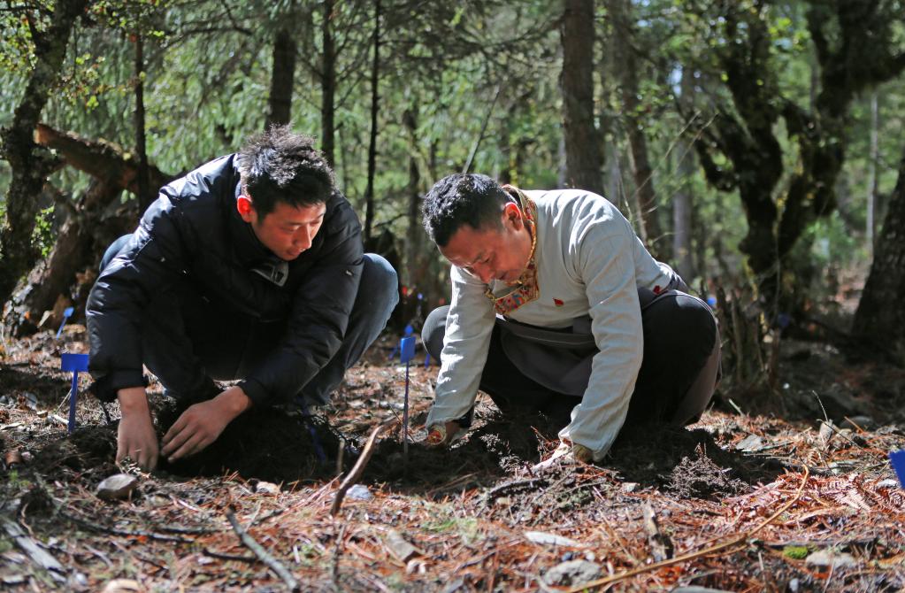 3月的波密,細(xì)雨綿綿,微微吹拂的春風(fēng)中夾雜著青草與泥土的芳香,巴桑頓珠行走在茂密的樹林間,不時蹲下身子查看天麻種苗的生長情況。