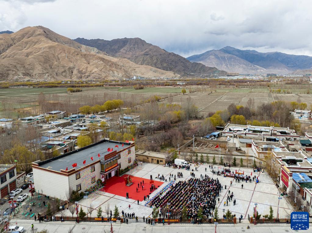 3月28日,在山南市乃東區(qū),西藏民主改革第一村陳列館重新開放,人們在陳列館前舉行儀式,紀念西藏百萬農(nóng)奴解放64周年(無人機照片)。新華社記者 孫非 攝