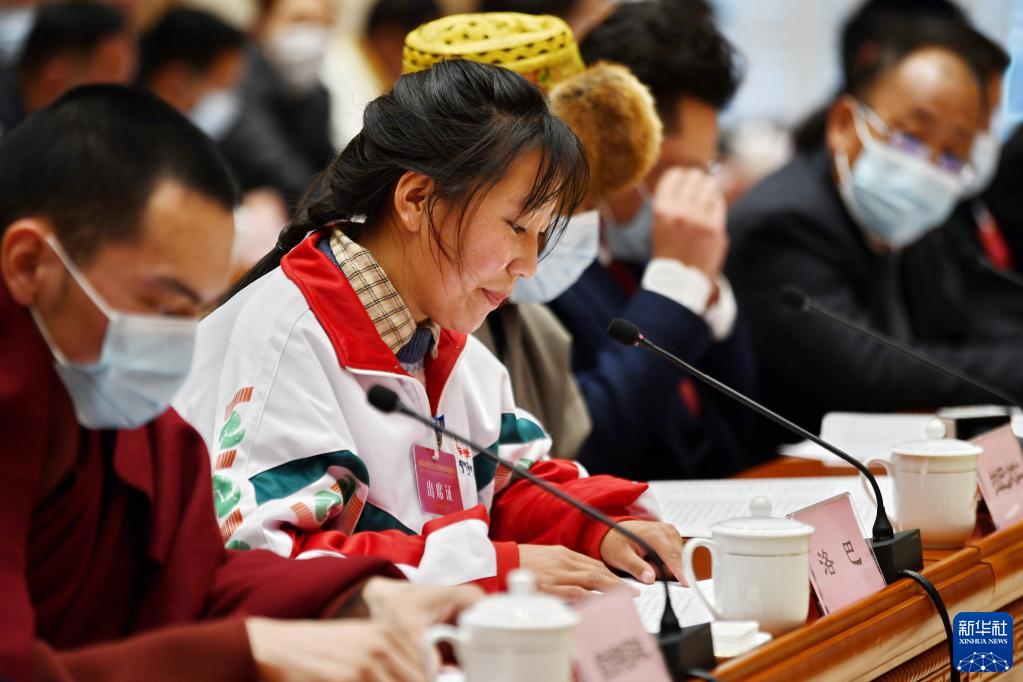 3月28日,拉薩中學高二學生洛巴(左二)參加慶祝西藏百萬農(nóng)奴解放64周年座談會時發(fā)言。新華社記者 張汝鋒 攝