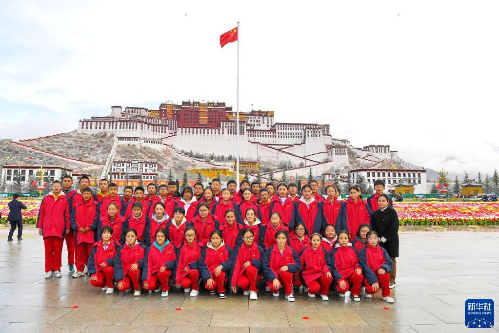 3月28日,在拉薩布達拉宮,參加升旗儀式的師生在廣場合影留念。新華社記者 張汝鋒 攝