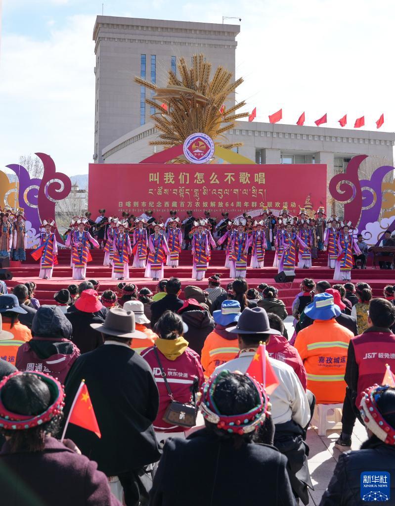 這是3月28日拍攝的日喀則市紀念西藏百萬農(nóng)奴解放64周年群眾聯(lián)歡活動現(xiàn)場。新華社發(fā)(何金龍 攝)