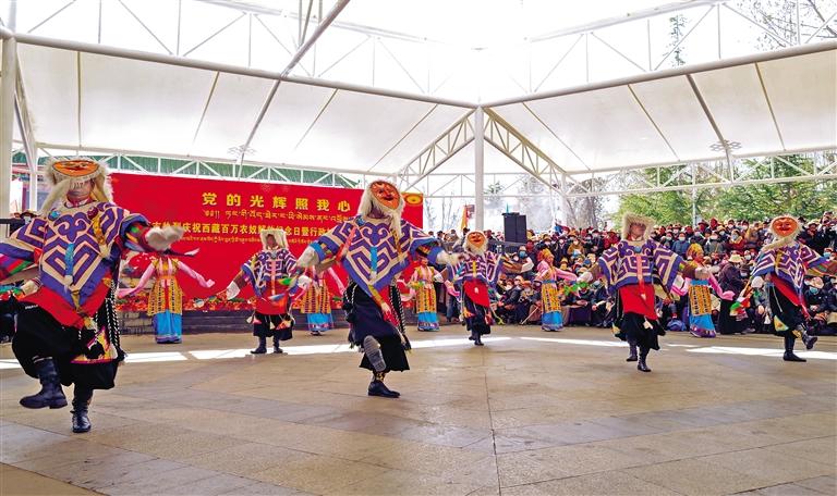 連日來,拉薩市城關(guān)區(qū)、堆龍德慶區(qū),山南市瓊結(jié)縣、那曲市班戈縣分別舉行紀(jì)念西藏百萬農(nóng)奴解放64周年文藝表演。優(yōu)美的歌聲、熱情的舞步,不時(shí)贏得在場觀眾的陣陣喝彩??赐暄莩觯罕娨嫖鞯┰黾?dòng)地說:“64年來,西藏發(fā)生了翻天覆地的變化,我們的生活越來越好,大家從內(nèi)心深處感謝黨和國家。”