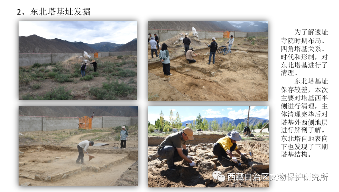 2022年,溫江多考古隊(duì)對遺址西南塔北側(cè)塔基、東北塔基址進(jìn)行了清理發(fā)掘,對遺址中區(qū)西部地層進(jìn)行了解,對遺址南部五峰山部分區(qū)域進(jìn)行了調(diào)查。發(fā)掘面積520平方米,出土磚、瓦、陶、石、骨、鐵等各類遺物標(biāo)本100件。西南角和東北角兩座佛塔均發(fā)現(xiàn)了上下疊壓的早、中、晚三期塔基,兩座塔基的平面形制和規(guī)格基本一致,均為平面呈多折角“亞“字形,土石結(jié)構(gòu)塔基,邊長均長約18米。遺址中區(qū)西部T0905探方內(nèi)清理出墻址2處,臺(tái)基1處。兩道墻址一為南北向夯土墻,一為東西向石墻,均位于④層下,與晚期塔基為同一時(shí)期。臺(tái)基1位于⑥層下,北部為一道東西向石砌臺(tái)基,內(nèi)部(南)為五花墊土層,與早期佛塔為同時(shí)期。調(diào)查工作在五峰山頂發(fā)現(xiàn)修行洞、修行點(diǎn)、小型塔基等共8處,在山北麓發(fā)現(xiàn)依山修建的具有一定規(guī)模的房居址、大型佛塔基址等共5處。