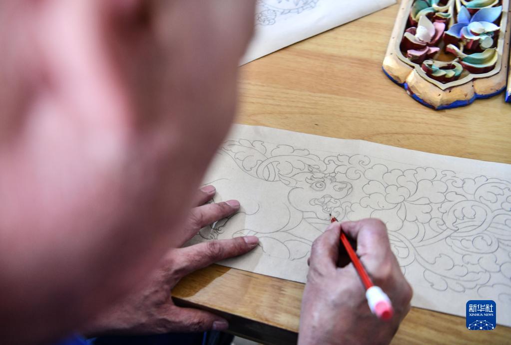 拉巴次仁在繪制木雕模板草圖(4月25日攝)。新華社記者 晉美多吉 攝