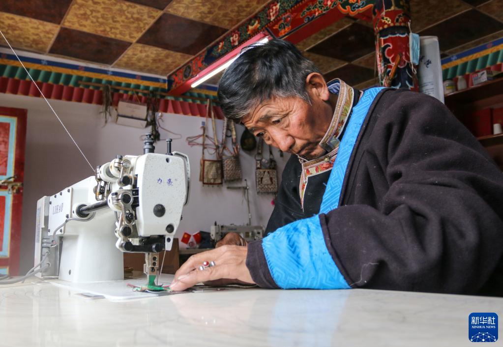 索朗群培在制作馬包(4月19日攝)。新華社記者 聶毅 攝