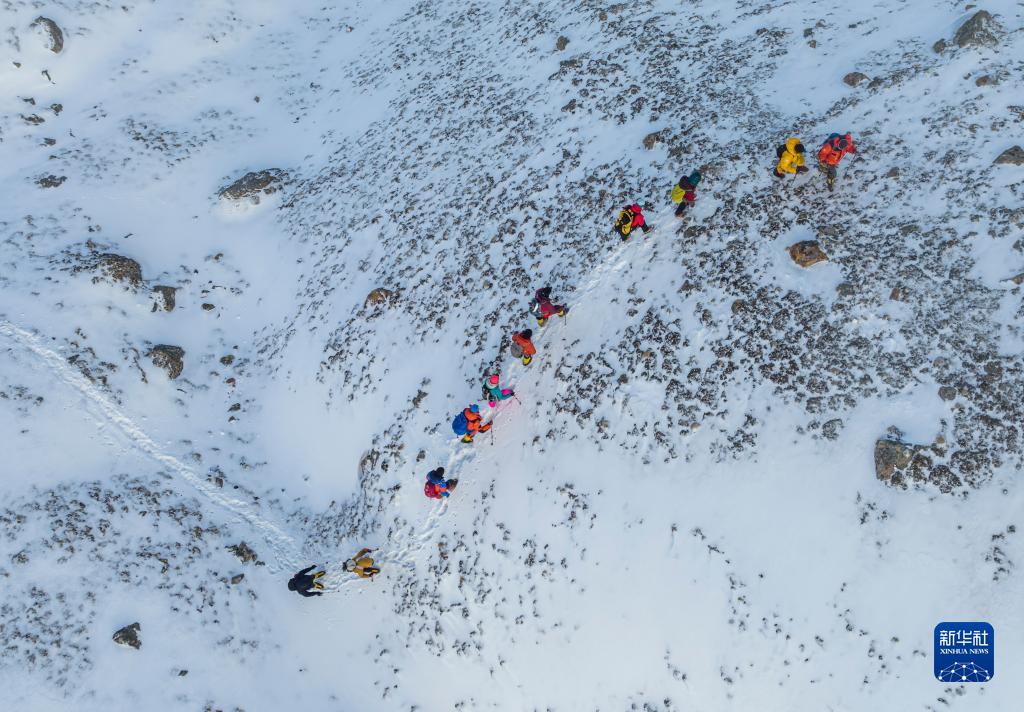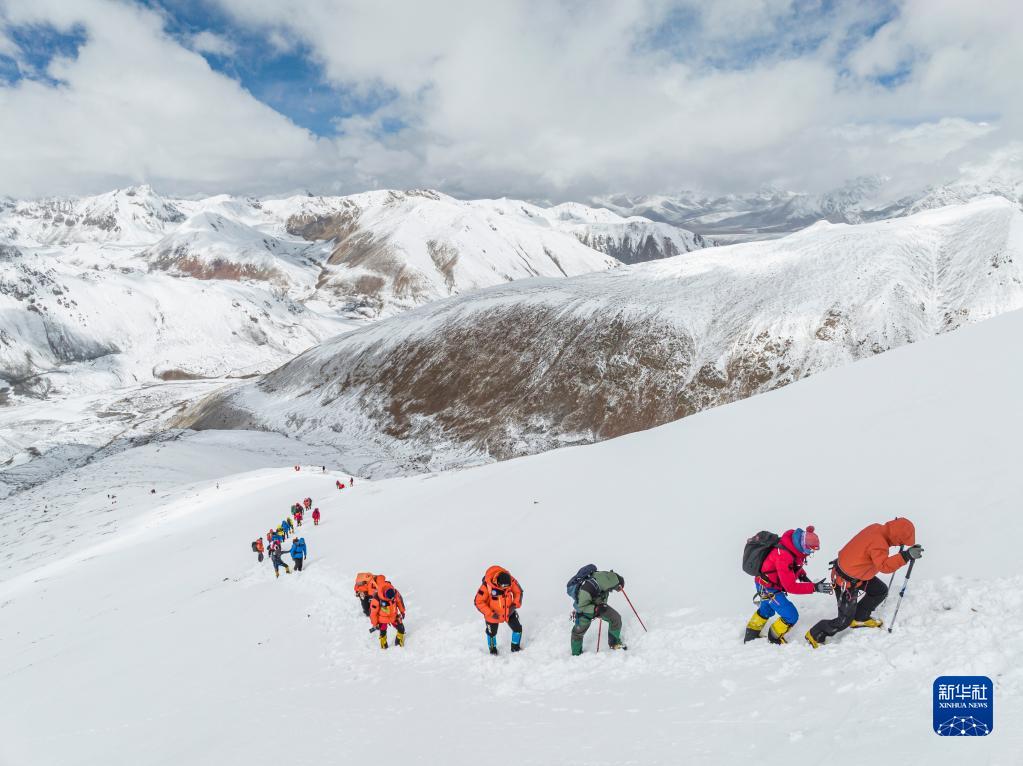 5月3日,登山愛好者正在向海拔6010米的洛堆峰峰頂進(jìn)發(fā)(無人機(jī)照片)。新華社記者 孫非 攝