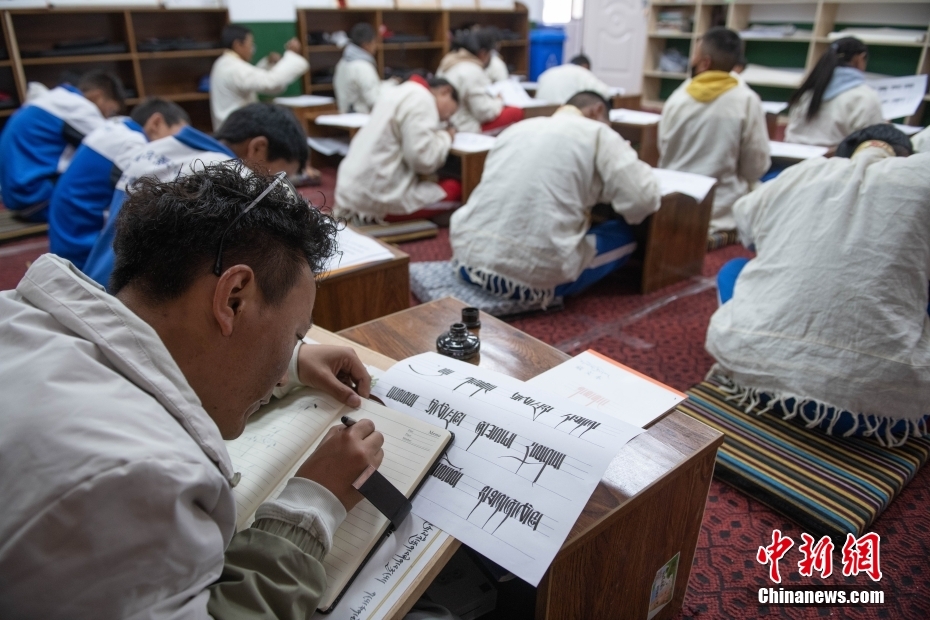 5月7日,西藏山南市,加查縣中學(xué)學(xué)生和教師在上藏文書(shū)法興趣班。該興趣班由2名藏文教師任教,每周兩課時(shí),利用自習(xí)課或晚自習(xí)時(shí)間為學(xué)生和教師授課。課程內(nèi)容包含執(zhí)筆、運(yùn)筆、姿勢(shì)等基礎(chǔ)書(shū)寫(xiě)技能,以及藏文中的烏金體、珠擦體、簇仁體、簇通體等各類(lèi)字體的書(shū)寫(xiě)方法。