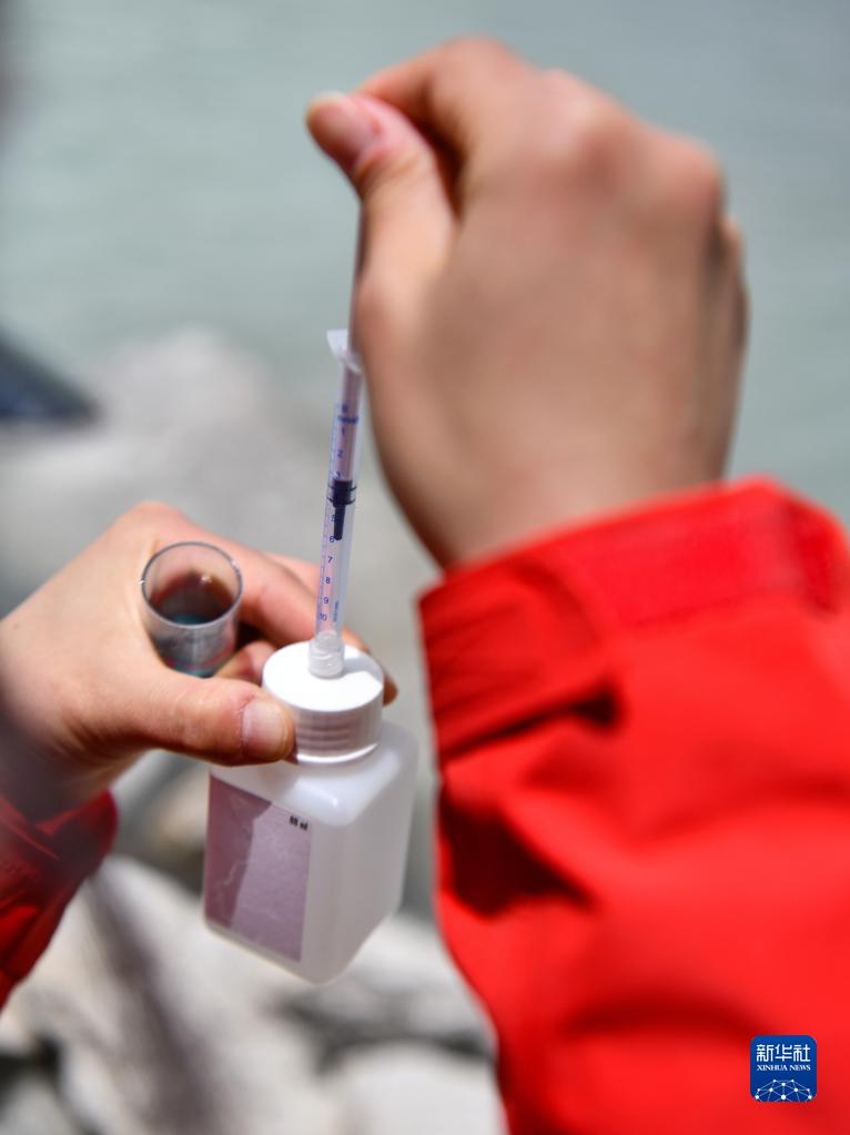 在珠峰登山大本營(yíng)附近,來自中國科學(xué)院青藏高原研究所的科考隊(duì)員邱海英在檢測(cè)絨布冰川末端水質(zhì)(5月14日攝)。新華社記者 孫非 攝