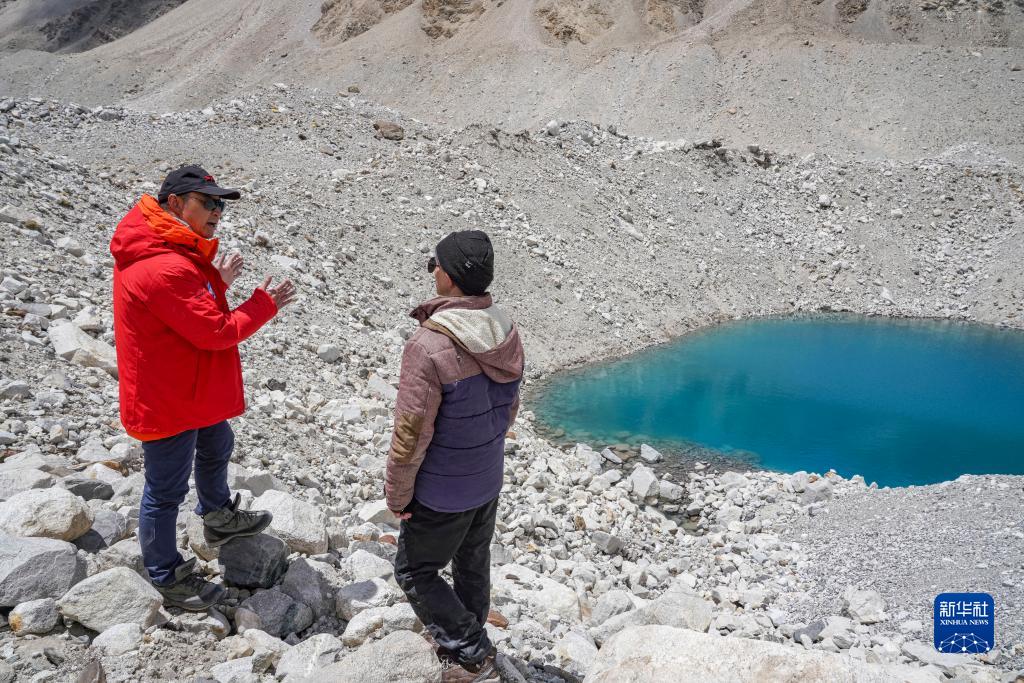 在珠峰海拔約5300米處,中國科學(xué)院西北生態(tài)環(huán)境資源研究院副院長(zhǎng)康世昌(左)和科考隊(duì)員討論冰面湖的形成原因(5月14日攝)。新華社記者 孫非 攝