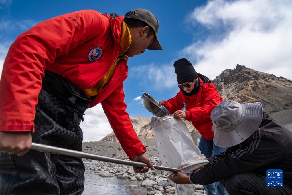 在珠峰登山大本營(yíng)附近,來自西藏大學(xué)生態(tài)環(huán)境學(xué)院的科考隊(duì)員在采集水生生物樣本(5月22日攝)。新華社記者 孫非 攝