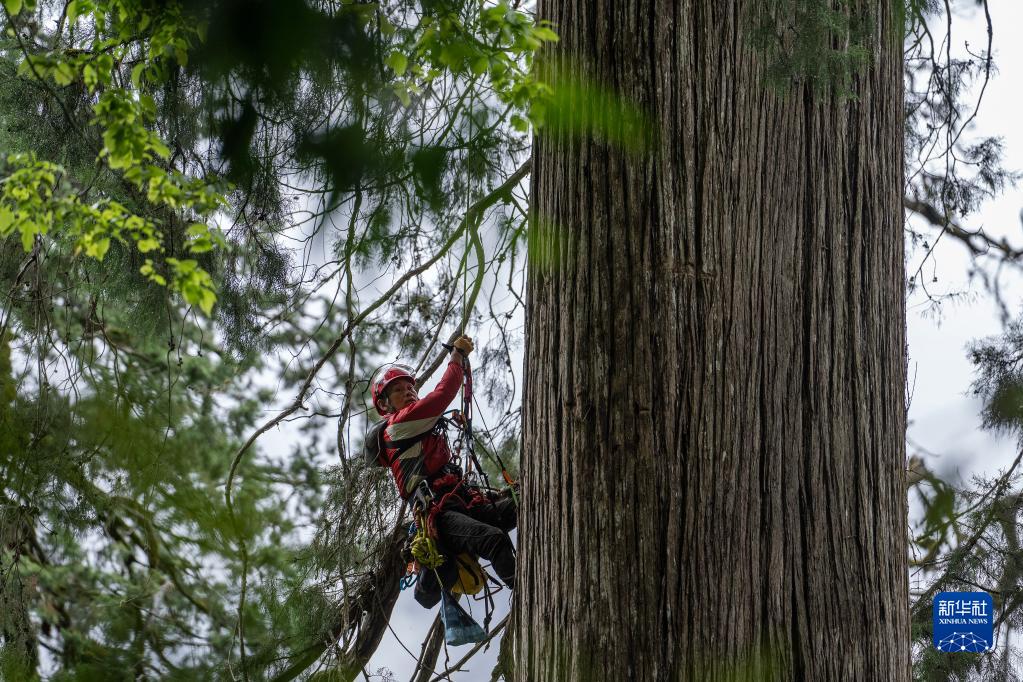6月15日,攀樹專家劉團璽在攀爬亞洲第一高樹前做準備工作。新華社記者 晉美多吉 攝