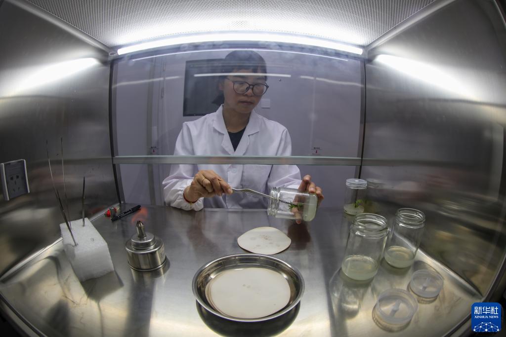 劉利平博士在高原核桃研究所用核桃組織培養(yǎng)標(biāo)本做實驗(7月27日攝)。新華社記者 姜帆 攝