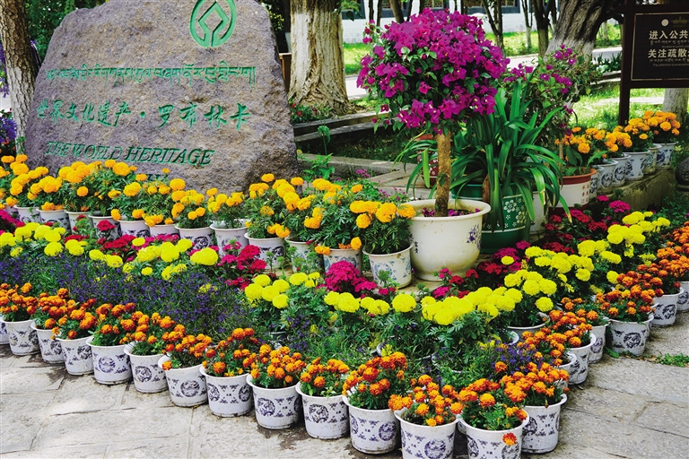 在達(dá)旦明久頗章附近一盆盆鮮花整齊地?cái)[放在道路兩旁,各類品種的花卉在園林工作人員的精心搭配下,變得更加絢麗奪目,吸引了不少人駐足觀賞。
