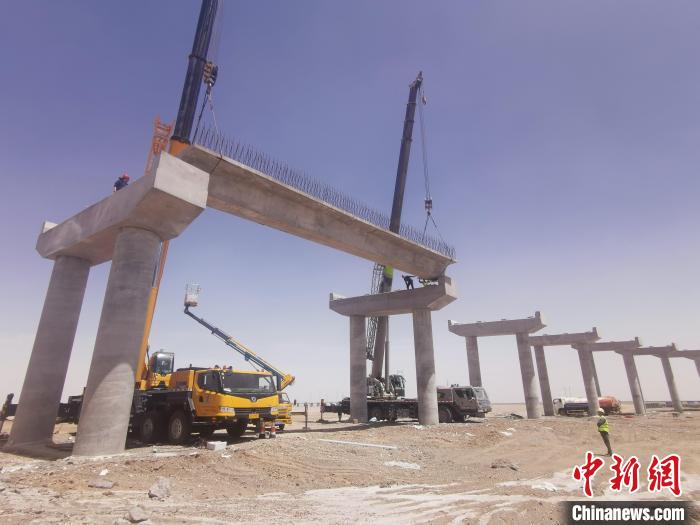 據(jù)介紹,跨青藏鐵路轉(zhuǎn)體橋梁設(shè)計長度687米,分主橋和引橋兩部分,引橋共設(shè)計箱梁116片。預(yù)制箱梁架設(shè)屬于高風(fēng)險施工,本次架設(shè)的首片箱梁設(shè)計長度20米,重量55噸,采用兩臺大型汽車吊協(xié)同作業(yè)完成架設(shè)。
