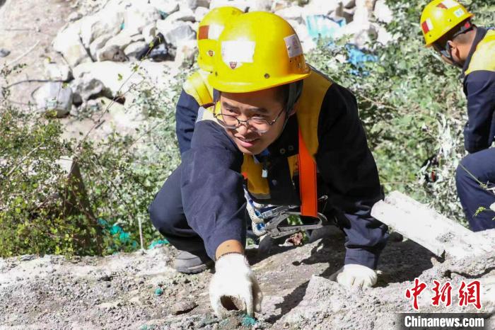 近日,在西藏山南雅魯藏布江畔的拉林鐵路安拉隧道口山崖上,中國(guó)鐵路青藏集團(tuán)有限公司拉薩基礎(chǔ)設(shè)施段加查橋隧工區(qū)的職工們對(duì)山體開展巡視,他們一邊攀爬,一邊小心用手錘敲擊巖石,對(duì)有空虛、容易滑落的石塊用自噴漆進(jìn)行標(biāo)記。遠(yuǎn)遠(yuǎn)看去,一群人猶如壁虎穿梭于懸崖峭壁之上。
