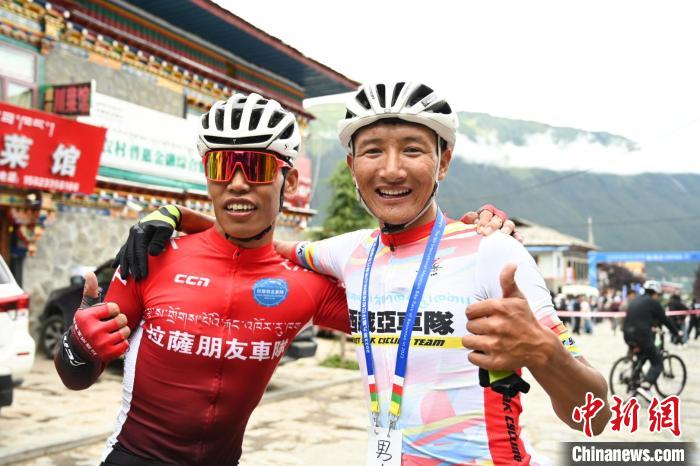 9月9日,第九屆環(huán)巴松措國際山地自行車越野競速賽在西藏林芝開賽。圖為江村羅布(右)與其他選手完成第一賽段。中新社記者 趙朗 攝