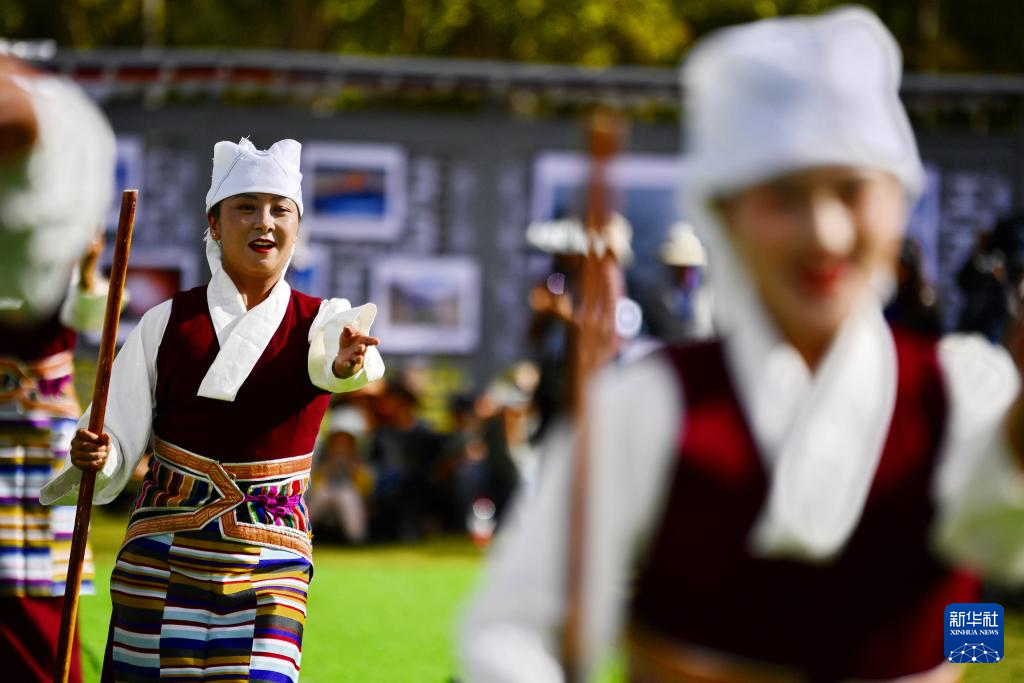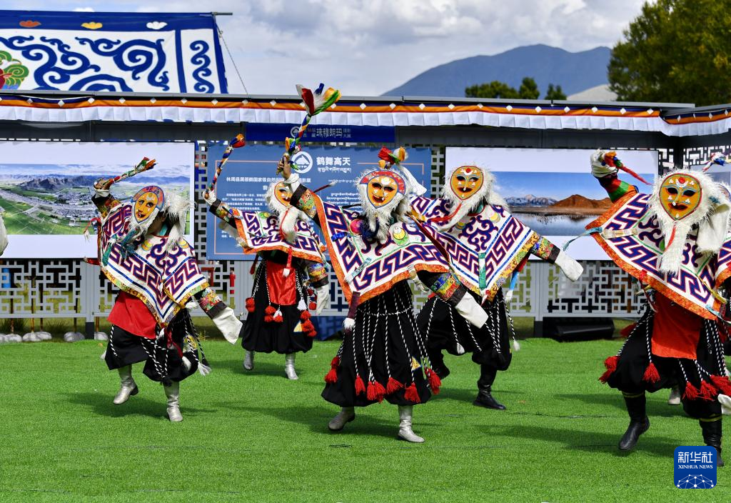 在拉薩市林周縣邊交林鄉(xiāng)當(dāng)杰村,演員在第十六屆西藏珠穆朗瑪攝影大展開幕式上表演節(jié)目(9月8日攝)。新華社記者 張汝鋒 攝