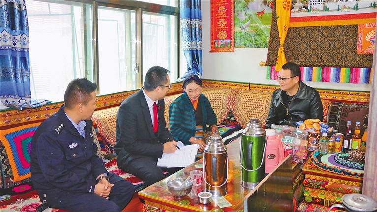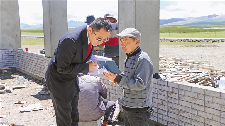 普瑪江塘中心法庭負責人巴桑次仁(左)正在向務工人員了解相關(guān)情況。