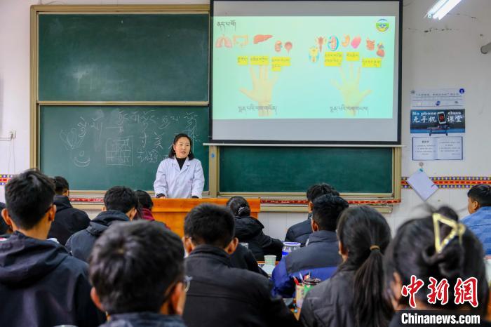 10月12日,西藏藏醫(yī)藥大學(xué)一課堂上,老師向同學(xué)們講述《四部醫(yī)典》中脈診相關(guān)內(nèi)容。中新社記者 江飛波 攝