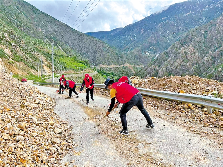 圖為芒康縣曲登鄉(xiāng)黨員開展志愿服務(wù)活動,清理阻塞道路的落石。