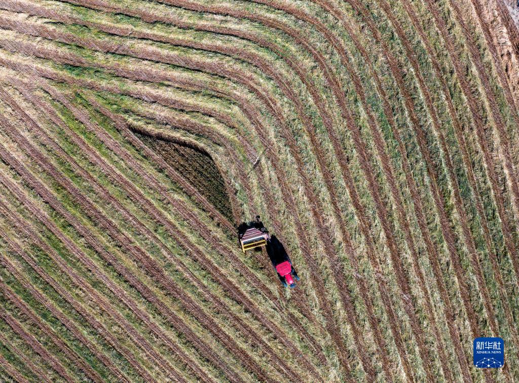 10月24日,村民駕駛農(nóng)機(jī)在拉薩市林周縣強(qiáng)嘎鄉(xiāng)曲嘎強(qiáng)村收割牧草(無(wú)人機(jī)照片)。新華社記者 姜帆 攝
