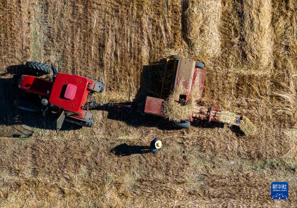 10月24日,村民駕駛農(nóng)機(jī)在拉薩市林周縣強(qiáng)嘎鄉(xiāng)曲嘎強(qiáng)村將收割過的牧草打包(無(wú)人機(jī)照片)。新華社記者 姜帆 攝