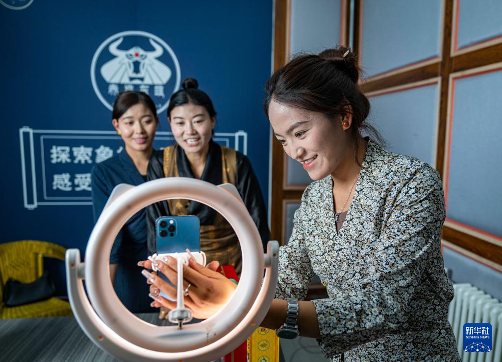 網絡主播在巴青縣“赤堆東雄”網紅直播間推介當地特色農牧產品(10月29日攝)。新華社記者 孫非 攝
