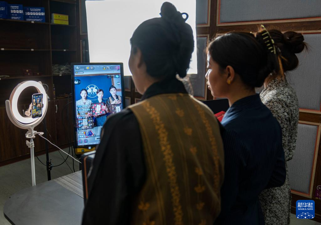 主播朗貢旺姆(右)和普么在巴青縣“赤堆東雄”網紅直播間挑選商品(10月29日攝)。新華社記者 孫非 攝
