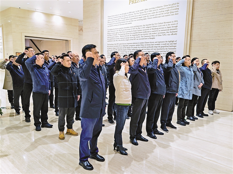 圖為學(xué)員們?cè)谥泄惨淮蠹o(jì)念館重溫入黨誓詞。徐晶 攝