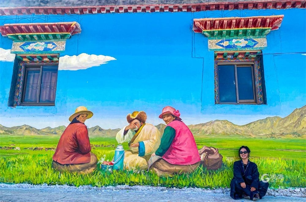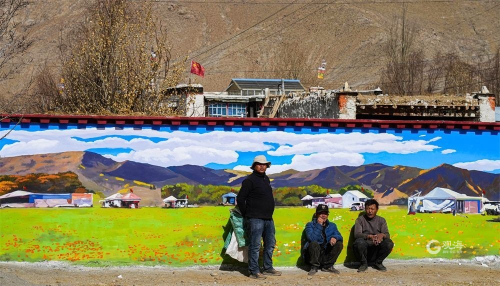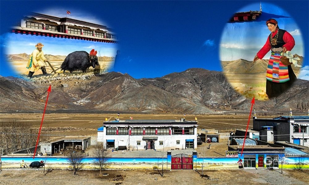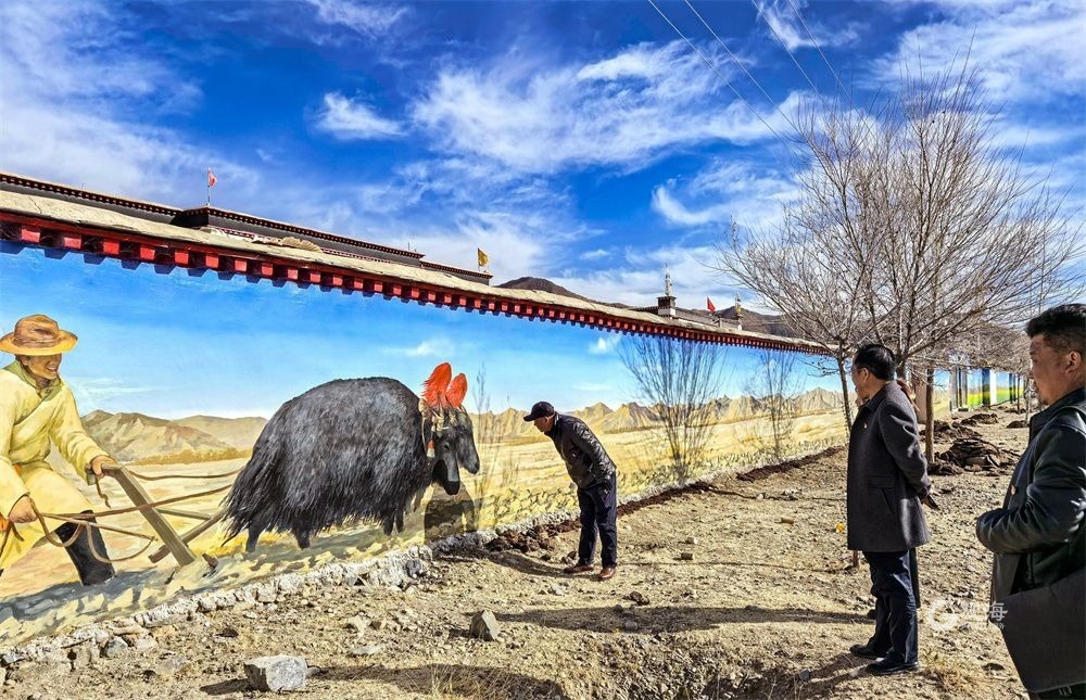 廣袤的高原上,在連綿起伏的山巒之下,是藏族農(nóng)家趕著傳統(tǒng)的“二牛抬杠”耕耘的場(chǎng)景,旁邊的“阿佳”則撒下希望的青稞種子……這樣的場(chǎng)景當(dāng)然不會(huì)出現(xiàn)在現(xiàn)在這個(gè)滴水成冰的季節(jié),而是躍然于藏家傳統(tǒng)村居的院墻之上?!拔壹疫@面墻原來(lái)就是貼滿(mǎn)了牛糞,現(xiàn)在畫(huà)上了我們平時(shí)勞動(dòng)的景象,感覺(jué)比之前更好看了。”桑珠孜區(qū)東嘎鄉(xiāng)色定村的村民旦瓊說(shuō),此前的一年又一年,他都是把牛糞貼在墻上,固然有傳統(tǒng)的高原美感,但是與現(xiàn)在院墻上畫(huà)的鄉(xiāng)村振興的場(chǎng)景相比,還是現(xiàn)在的感覺(jué)更不錯(cuò)。