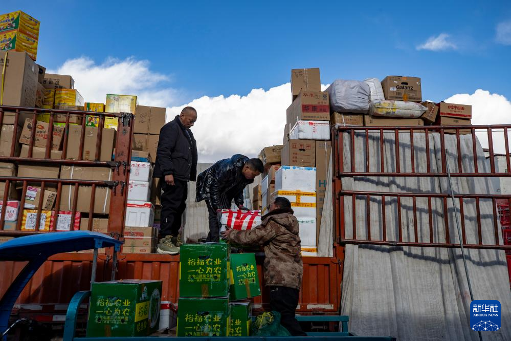 申扎縣供銷合作社員工在拉薩為偏遠(yuǎn)鄉(xiāng)鎮(zhèn)果蔬配送試點(diǎn)項目的貨車上貨(1月2日攝)。新華社記者 姜帆 攝