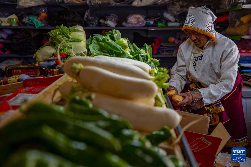 申扎縣馬躍鄉(xiāng)貝嘎四村偏遠(yuǎn)鄉(xiāng)鎮(zhèn)果蔬配送試點(diǎn)項目直銷點(diǎn),店主西熱加措在整理供銷合作社配送來的新鮮蔬菜(1月5日攝)。新華社記者 姜帆 攝