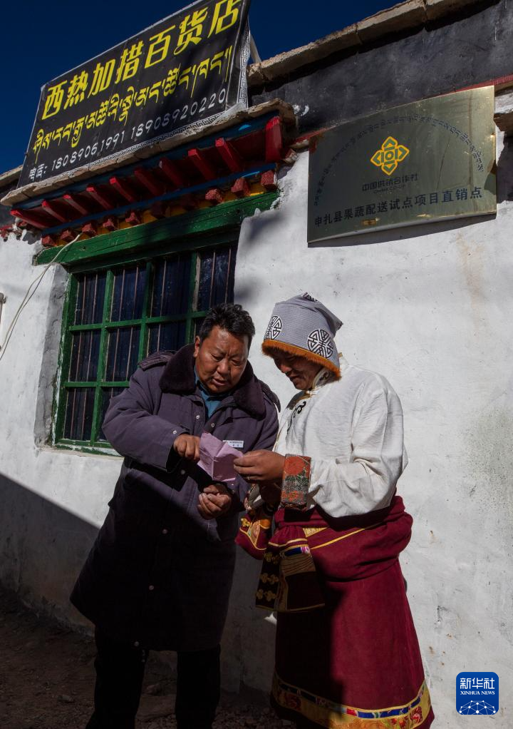 申扎縣供銷合作社的配送負(fù)責(zé)人吳瓦(左)與馬躍鄉(xiāng)貝嘎四村偏遠(yuǎn)鄉(xiāng)鎮(zhèn)果蔬配送試點(diǎn)項目直銷點(diǎn)店主西熱加措核對配送清單(1月5日攝)。新華社記者 姜帆 攝