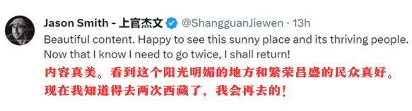 此外,新西蘭媒體人安柏然、《沙特阿拉伯新聞》記者賈邁勒·杜巴希、愛沙尼亞-中國商會(huì)主席達(dá)維德·維克托、美國反戰(zhàn)人士克里斯蒂·富蘭克林,我駐馬爾代夫大使館和駐意大利、英國、巴基斯坦外交官轉(zhuǎn)贊評,紛紛對西藏的美麗景色和深厚文化表示贊賞。