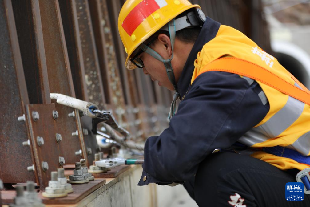 加查橋隧工區(qū)副工長(zhǎng)張亮在檢查藏木特大橋螺絲銹蝕情況(1月27日攝)。新華社發(fā)(拉巴次仁攝)