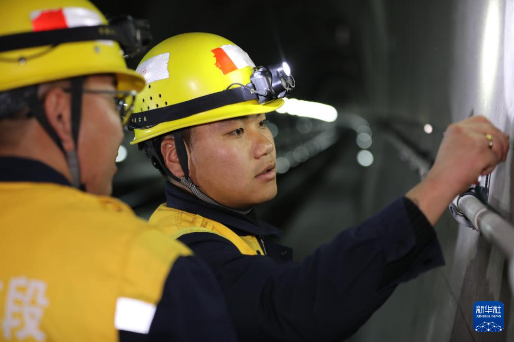 加查橋隧工區(qū)副工長(zhǎng)東生瑞(左)檢查達(dá)嘎拉隧道狀況(1月27日攝)。新華社發(fā)(拉巴次仁攝)