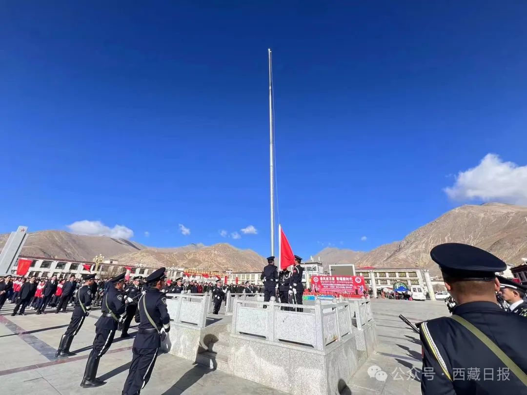 日喀則市南木林縣各族干部群眾1500余人聚集在民族團(tuán)結(jié)廣場舉行紀(jì)念西藏百萬農(nóng)奴解放65周年升國旗唱國歌儀式。