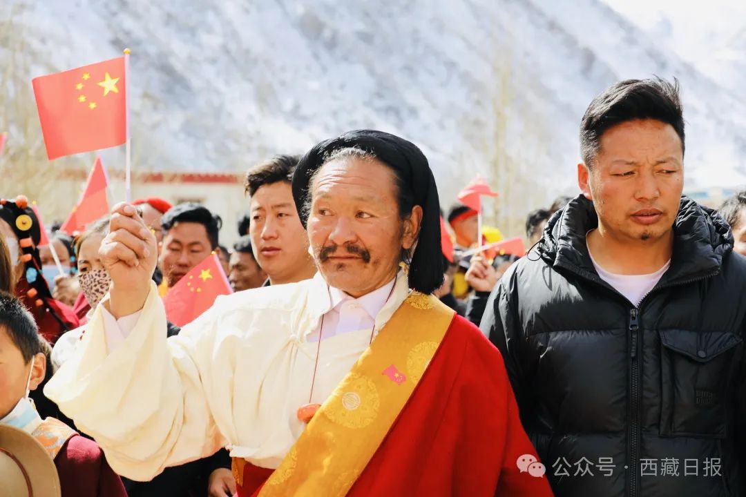 日喀則市薩迦縣麻布加鄉(xiāng)舉行“叫我們怎么不歌唱”紀(jì)念西藏民主改革65周年升國旗唱國歌儀式。