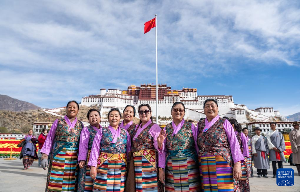 3月28日,人們在布達(dá)拉宮廣場參加升旗儀式后合影留念。新華社記者 丁增尼達(dá) 攝