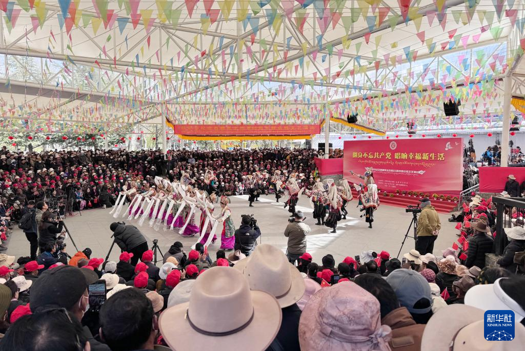 3月28日,群眾在拉薩市宗角祿康公園內(nèi)觀看文藝演出,慶祝西藏百萬農(nóng)奴解放65周年。新華社記者 晉美多吉 攝