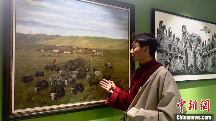 大賽美術(shù)組二等獎獲得者、西藏大學(xué)藝術(shù)學(xué)院美術(shù)系研一學(xué)生郭扎正在向觀眾展示自己的美術(shù)作品。澤塔雍措 攝