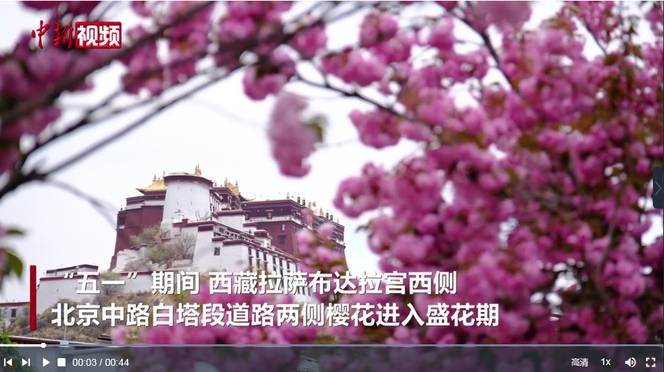 “五一”期間,西藏拉薩布達(dá)拉宮西側(cè)北京中路白塔段道路兩側(cè)櫻花進(jìn)入盛花期,花枝爛漫,引來(lái)不少過(guò)往市民、游客駐足拍照“打卡”。北京中路附近正好有個(gè)公交站臺(tái)白塔站,市民、游客可花下乘車(chē),春夏之交,高原景色宜人。(記者 江飛波 制作 劉鵬)