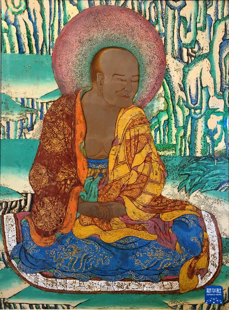 仁青郎加的第一幅唐卡漆畫作品——《指小路尊者》。新華社發(fā)