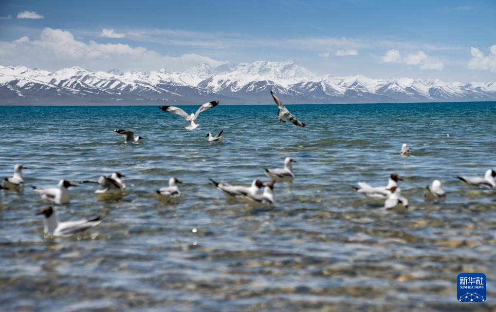 一群棕頭鷗在冰雪消融的納木錯湖面停留(5月19日攝)。新華社記者 丁增尼達(dá) 攝