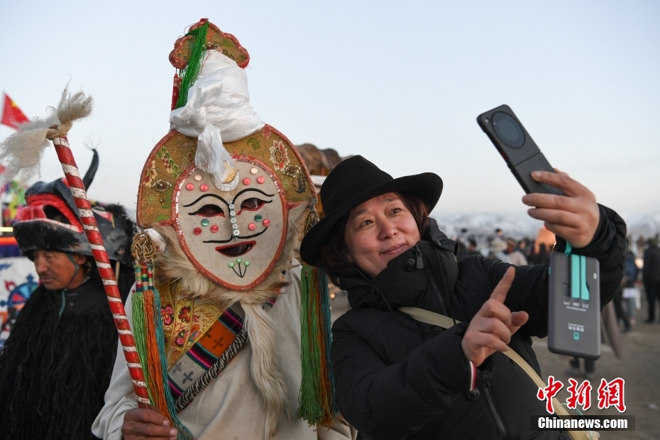 5月18日晚,西藏拉薩市當(dāng)雄縣納木錯(cuò)湖畔,當(dāng)?shù)啬撩駧в慰腕w驗(yàn)篝火鍋莊舞。納木錯(cuò),被譽(yù)為“天湖”,吸引著大量游客前來(lái)觀光。圖為游客跟演職人員合影。